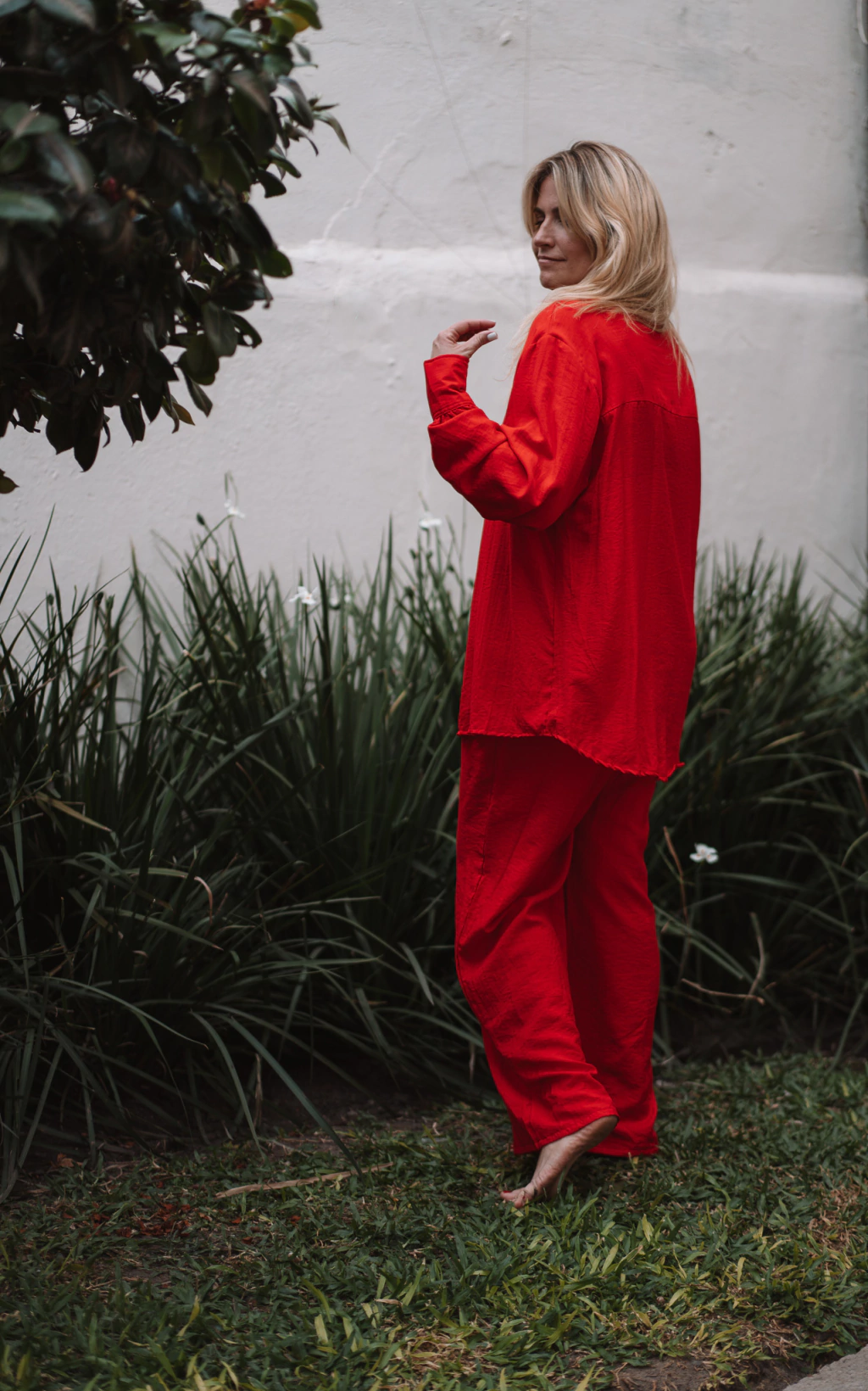 Liviano, elegante y con un toque de brillo que se asoma cuando le da la luz. El Pant Samantha está confeccionado en lino lurex rojo, una tela fresca con textura natural y un destello sutil. Su calce relajado y elástico trasero hacen que sea tan cómodo como llamativo.